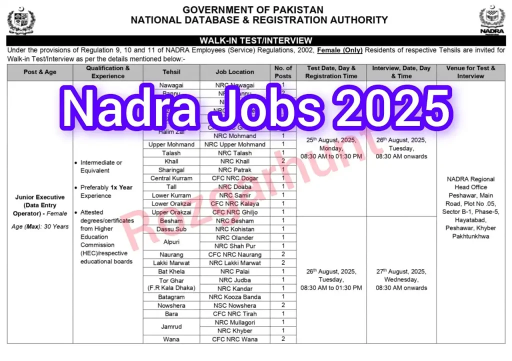 The Peshawar Region is offering contractual positions for Junior Executive (Data Entry Operator) – Female across multiple locations including Pabbi, Bannu, Lakki Marwat, CFC Tittar Khel, CFC NRC Naurang, Kooza Banda, Kohistan, Judba, Doaba, Khall Dir Lower, Talash, Malakand, Shah Pur, Besham, Sharingal, Nawagai, CFC NRC Takia, Khyber Agency, CFC NRC Dogar, CFC NRC Sadda, Mohmand Agency, CFC NRC Ghalanai, CFC NRC Boutha, CFC NRC Kalaya, CFC NRC Ghiljo, CFC NRC Wana, and Naushera. Applicants must be female, not more than 30 years of age, and hold at least an Intermediate or equivalent qualification, preferably with one year of relevant experience. All degrees or certificates must be attested by the Higher Education Commission (HEC) or respective educational boards. The last date to apply is 24 August 2025.
