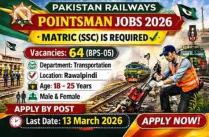 Pakistan Railways has announced Pointsman (BPS-05) vacancies in the Transportation Department at Rawalpindi Division. This is a golden opportunity for candidates holding an certificate who want to start their career in a respected federal government department. The job falls under the Skill Worker Services category and will be offered on a contract basis. A total of 64 vacancies have been announced and both male and female candidates aged 18 to 25 years can apply. The last date to submit applications is 13 March 2026 and applications will be accepted through By Post only.